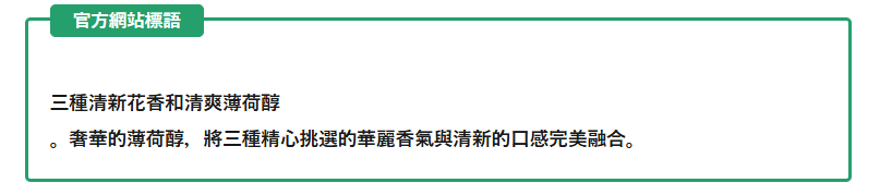 香氣:●●●●●、濃鬱度:●●●○○、薄荷醇濃度:●●●○○
