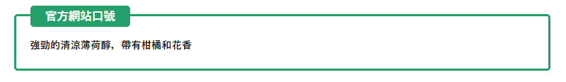 這款品的整體特點是注重口味,含有濃烈的薄荷醇,能帶來烈的提神效果,帶有淡淡的柑橘和薰衣草香味.